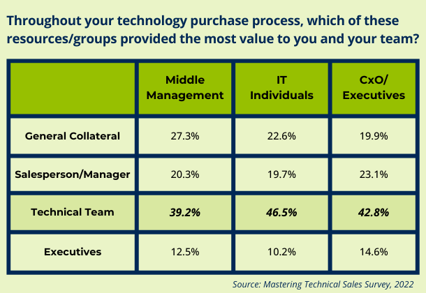 Technical sales holds a unique power in the sales process. A survey from Mastering Technical Sales found that 39% of Middle Management and 43% of C-Level Executives considered the Technical team to be their most valuable resource in the buying process.